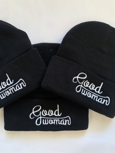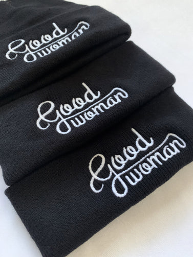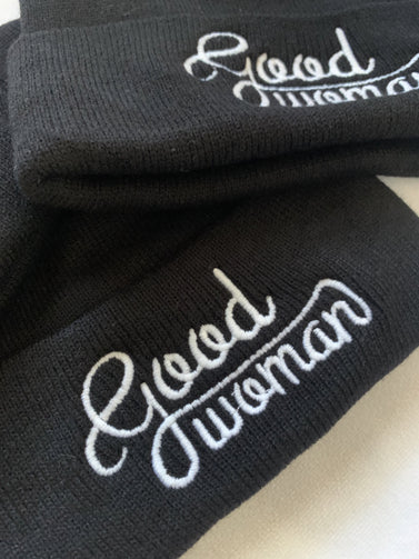 Good Woman logo embroidered with Glow in the Dark Thread on black knit hat.