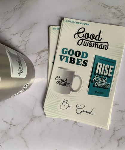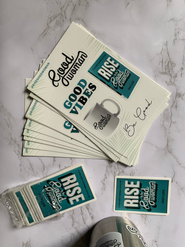 Sticker Sheet: Signature Good Woman logo, Good Woman Mug, Good Vibes, Rise of the Good Woman Mini Book, Be Good stickers. 6 stickers total. Printed with Sticker Mule